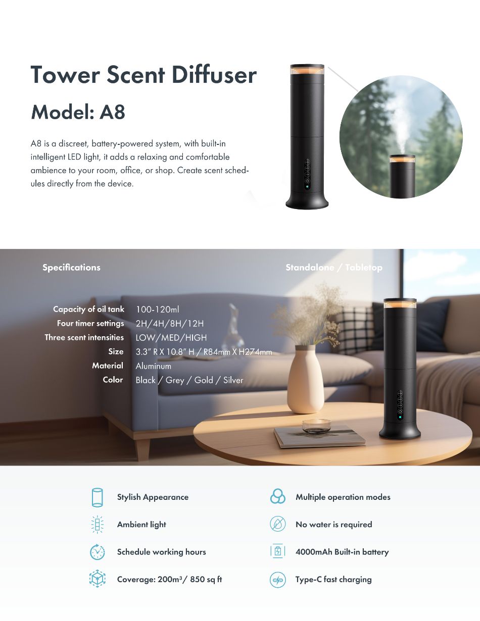A8 is a discreet, battery-powered system, with built-in intelligent LED light, it adds a relaxing and comfortable ambience to your room, office, or shop. Create scent schedules directly from the device.