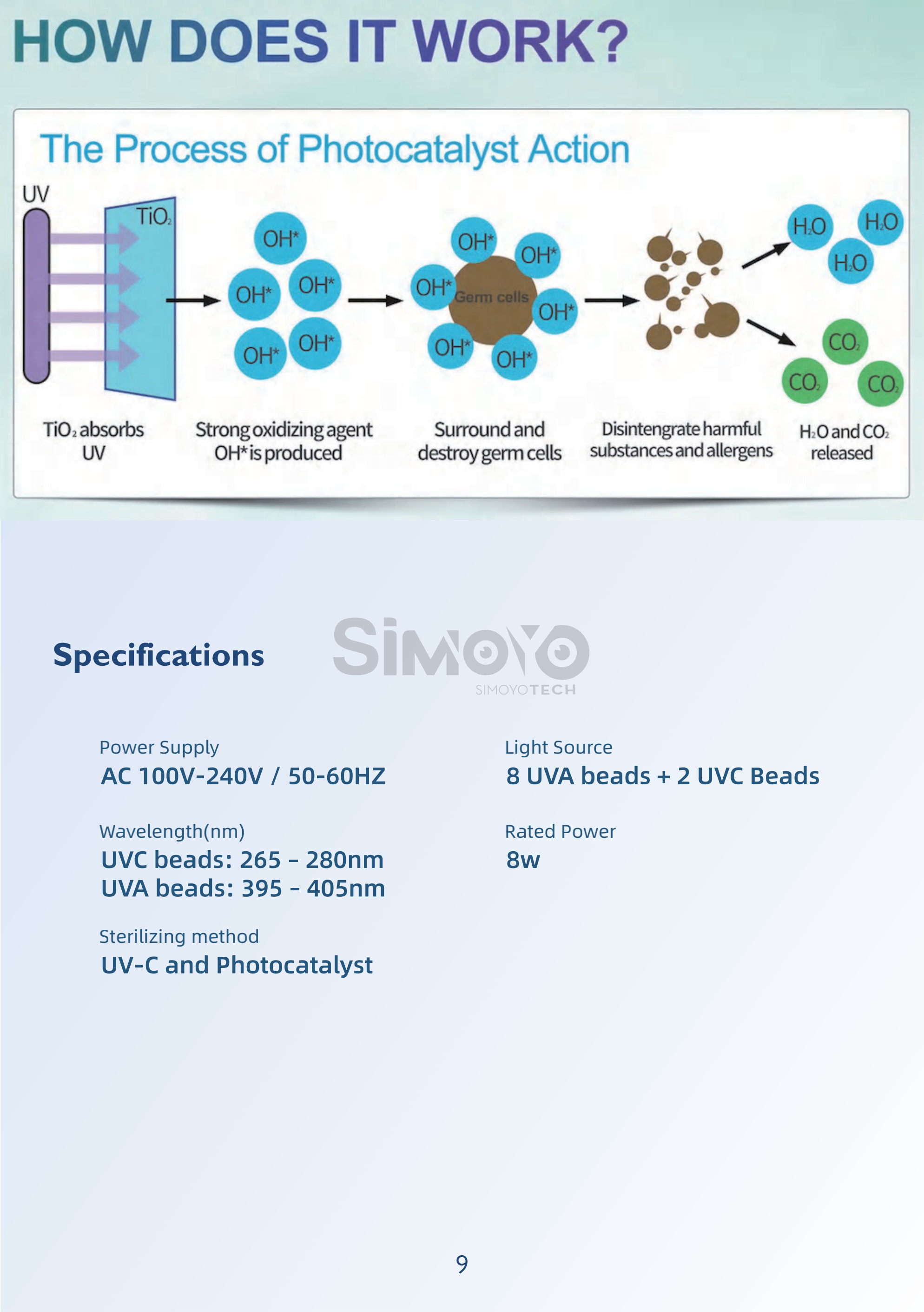 • Sterilizing Technology: UV-C and Photocatalyst